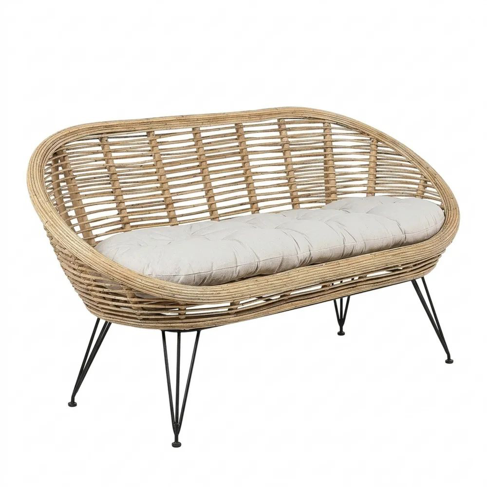 Gartensofa aus Rattan mit beiger Auflage und schwarzen Metallbeinen im Boho-Stil